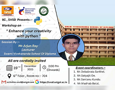 A Hands-on workshop was held at Swami Vivekananda School of Diploma, Malandighi, Durgapur-713212.... From 14th December 2022. After completing the Internship, I, the student will prepare a comprehensive report to indicate what he/she has observed and learned during the training period. This program is completed with the support of mentioned conveners and co-conveners and special thanks to Mr. Chanchal Kumar Pal who supports his experience to complete it lucidly.